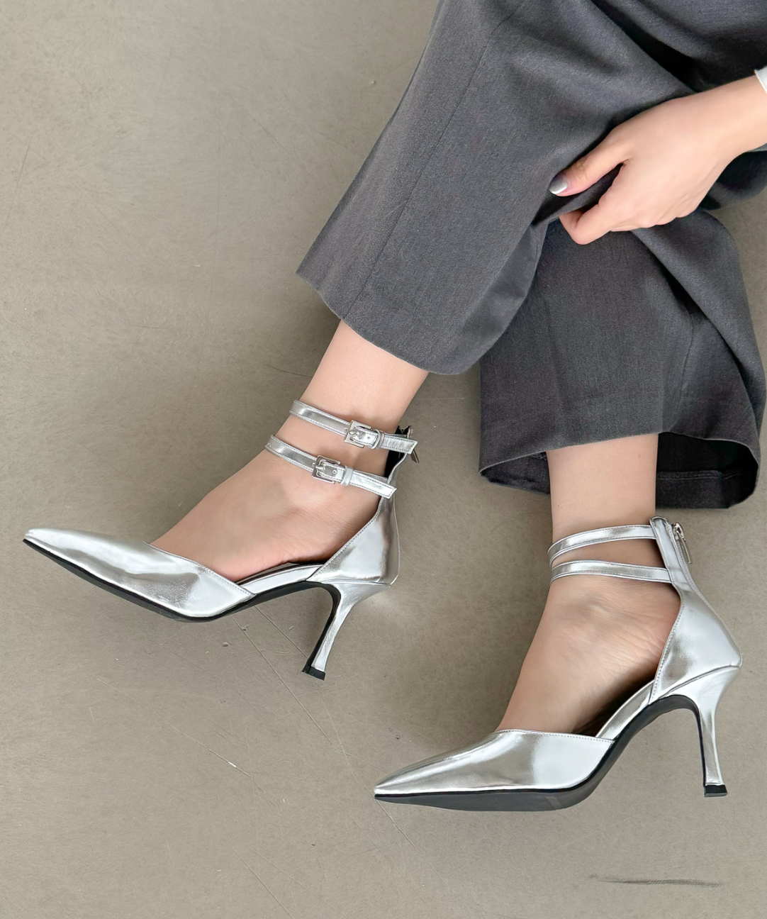 샤본✨ (블랙, 실버) 스틸레토 앵클 더블 벨트 힐 하객룩 발목 스트랩 결혼식 구두 가을 겨울 슈즈