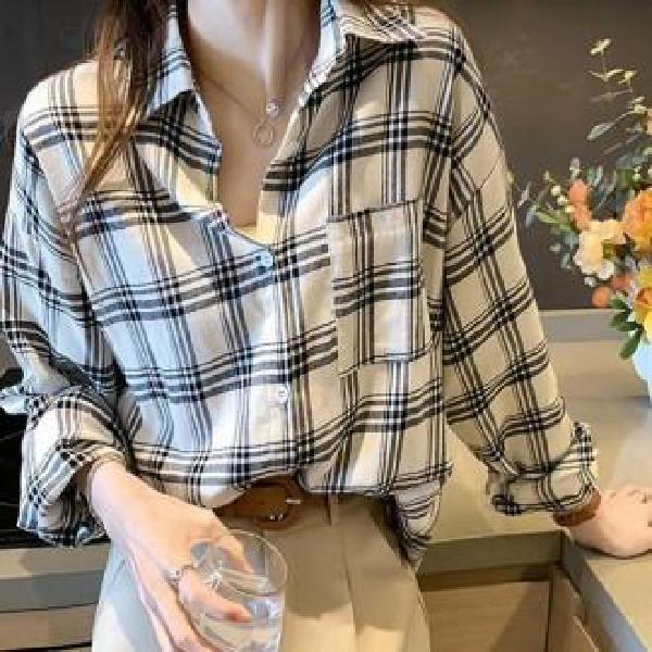 여성 캐주얼 체크 남방 셔츠 봄블라우스 가을 패션 빈티지 남방셔츠 체크무늬 루즈핏