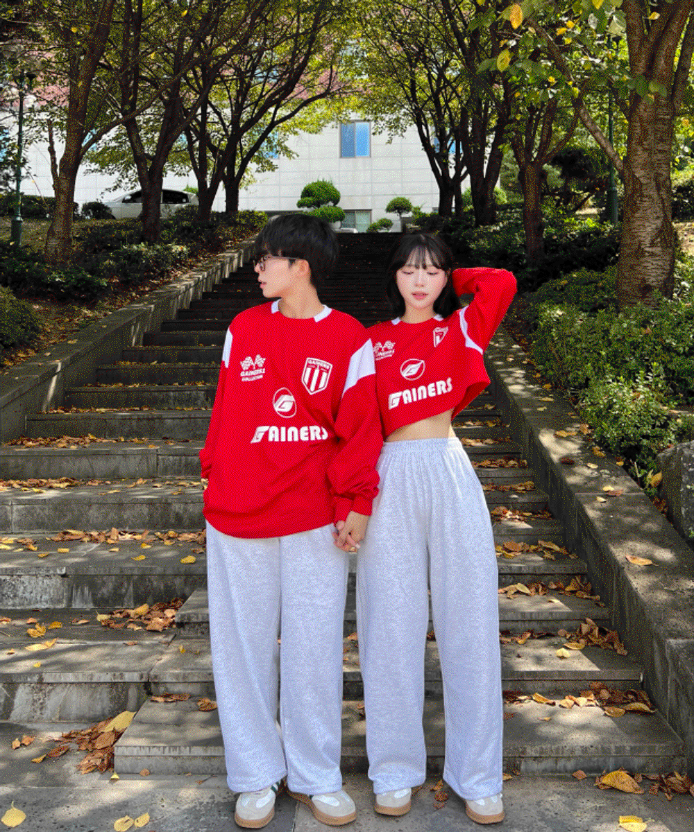 [기모ver추가🔥] 커플 바시티 맨투맨 크롭 오버핏 남녀공용 커플룩 시밀러룩 여행 데이트 힙 Y2K 트레이닝 팬츠
