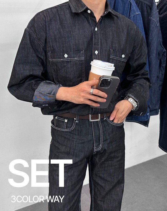 [남녀공용][SET] 셔츠+팬츠 세트상품 커플 청청 논페이드 데님세트 셋업 오버셔츠 남자셔츠 청남방 와이드청바지 빅사이즈 남자옷