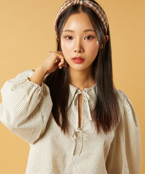 미디 크롭 퍼프 리본끈 스트라이프 긴팔 셔츠 [IVORY]
