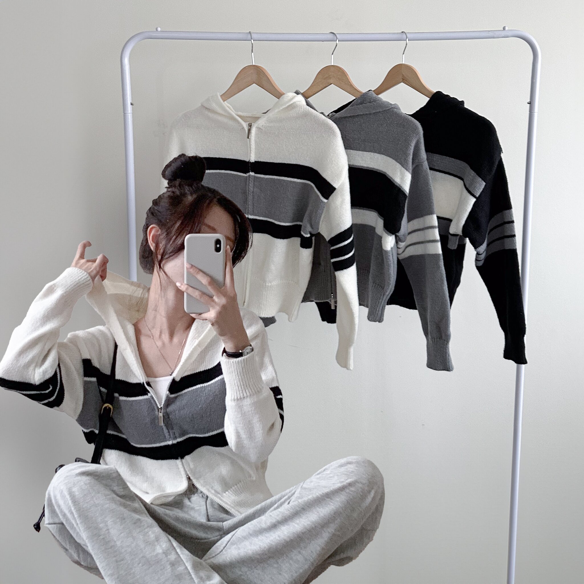 (당일) [꾸안꾸/투웨이] 배색 단가라 후드집업 긴팔 니트 (3color)