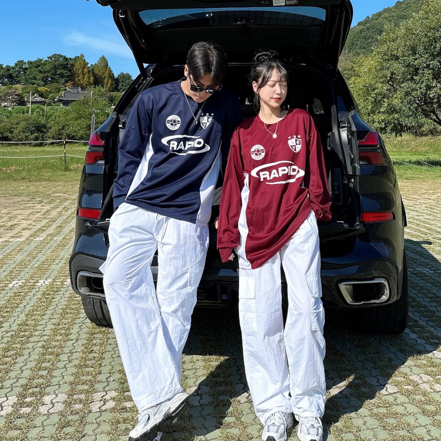 특가!세트가능 블록코어 오버핏 긴팔 저지티 배색 기능성 티셔츠 바스락 카고 와이드 팬츠 나일론 스트링 조거 남녀공용 트레이닝 세트 봄 가을 커플룩 꾸안꾸 커플티 빅사이즈 라피드