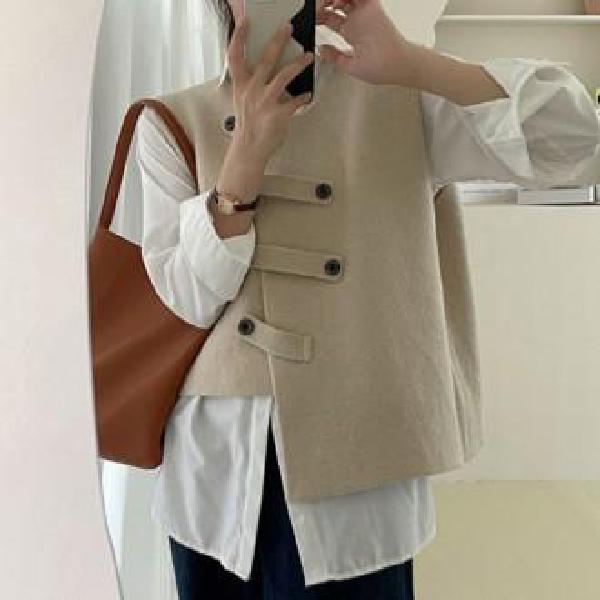 고퀄리티 꾸안꾸 데일리 겨울 단추 매듭 포인트 여성 니트 조끼 베이지