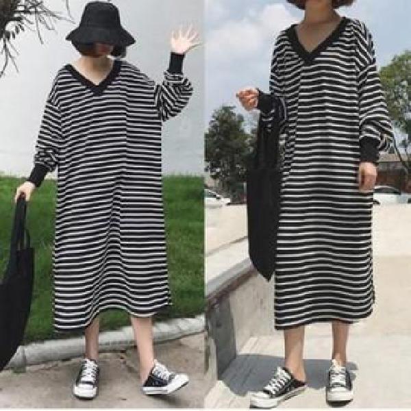 F0498 V넥 루즈 스트라입 니트 롱 원피스 단가라