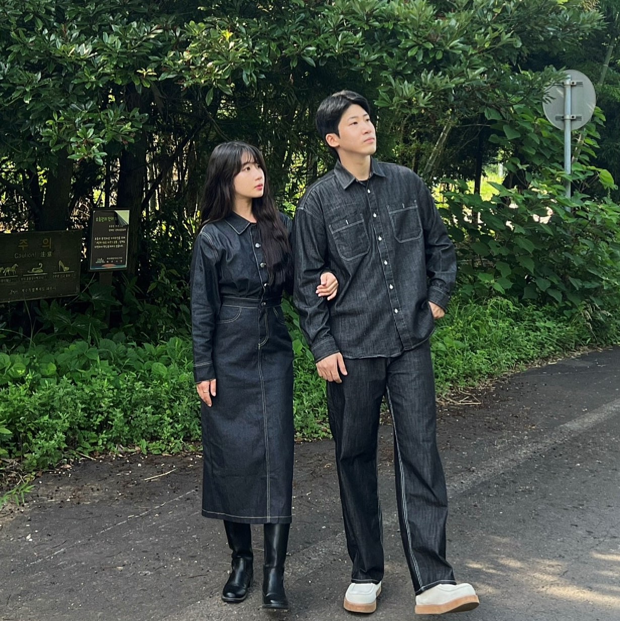 단독진행! [청청코디/시밀러룩] 데님 포켓 롱원피스 셔츠 팬츠 생지 바지 가을 커플룩 스티치 데이트룩 여행룩 코디세트