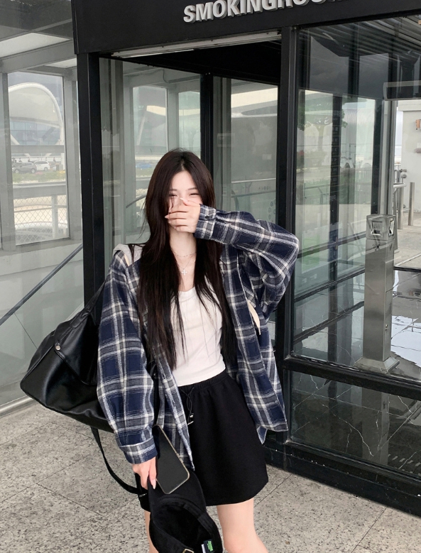 (당일출고) 블루네이비 루즈핏 유니크 데일리 후드 체크셔츠