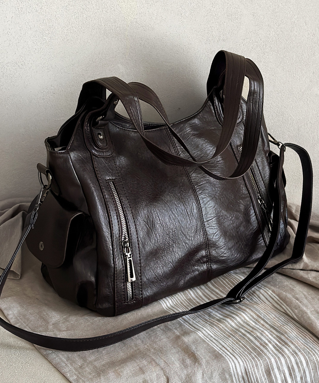 당출🚀[high quality🖤] 빈티지 더블 지퍼 오버핏 포켓 레더 숄더백 크로스백 2color
