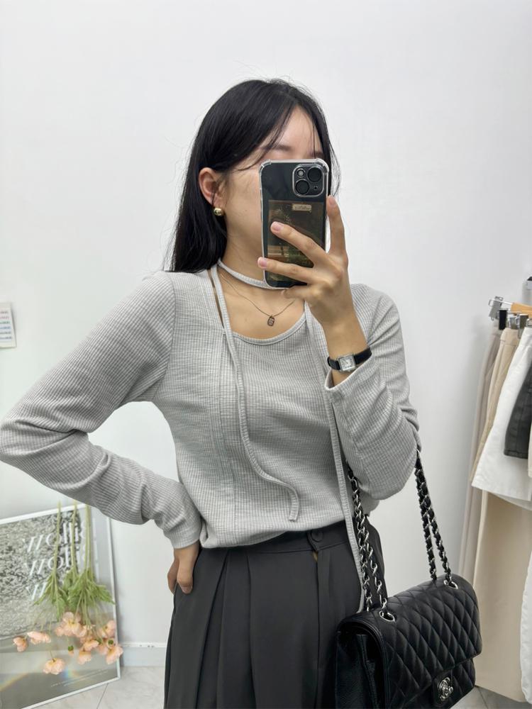 타이 머플러 사선 긴팔 티셔츠 (그레이)