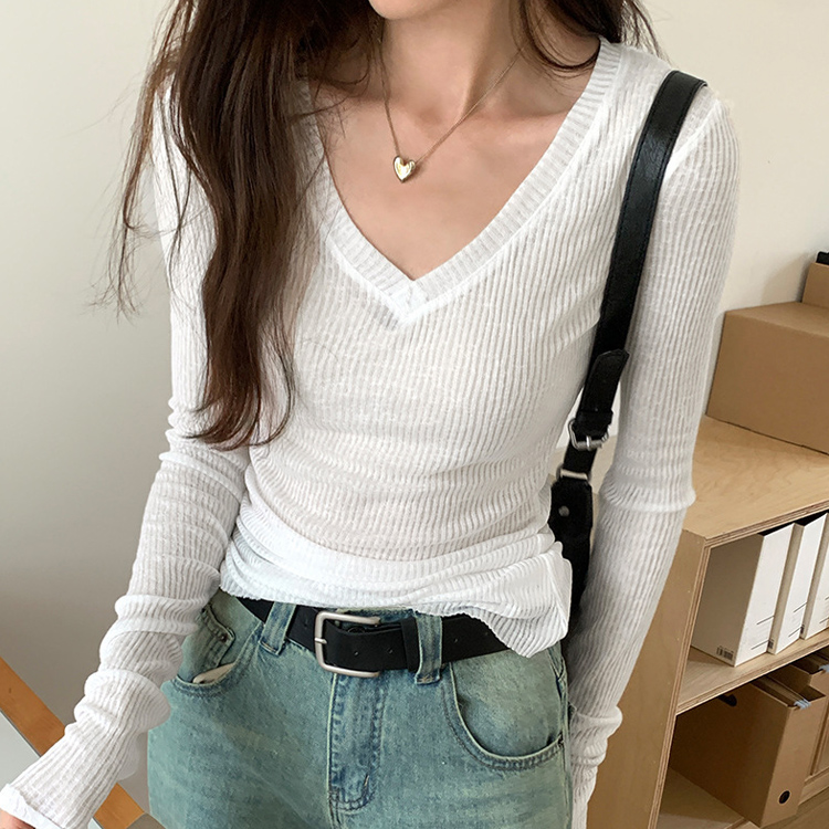 (당일출고/데일리룩추천) 긴팔 브이넥 슬림핏 골지 시스루 데일리 롱 니트 티셔츠 6color