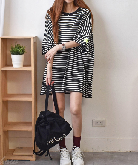 [왕오버핏/2color] 배색 스트라이프 단가라 롱티 오버사이즈 반팔 박스티 봄 여름 줄무늬롱티셔츠 박시핏 박스티 배색 롱티 원피스티 티셔츠원피스 루즈핏 배색티 빅사이즈 박스티