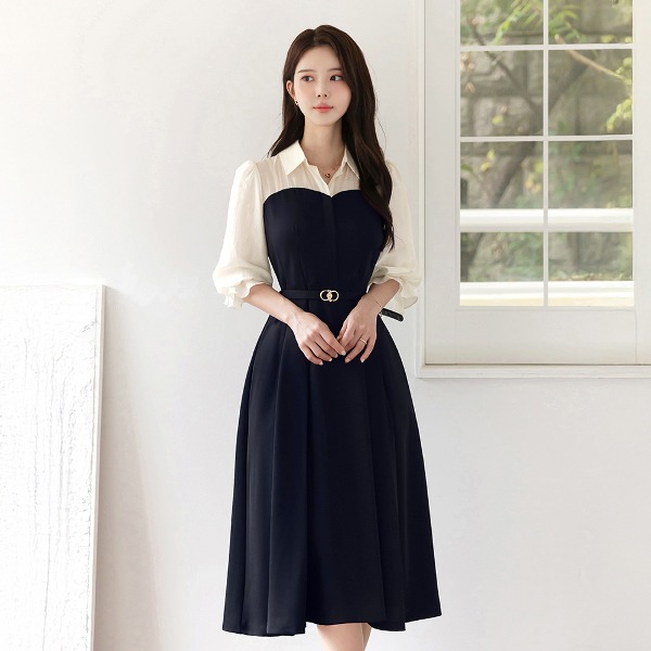 시트리 오픈카라 레이어드 퍼프 숄더 플레어 벨트 원피스