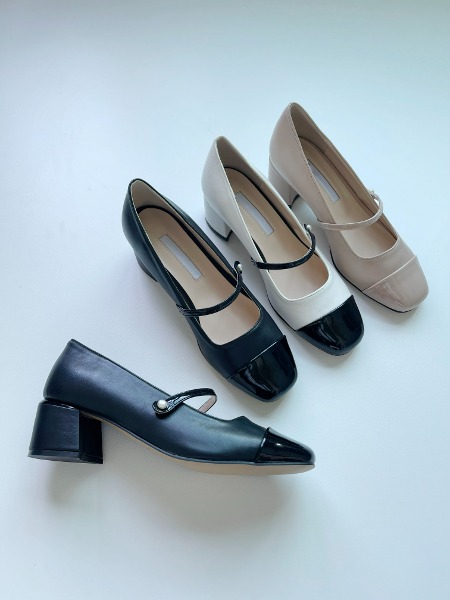 둥근 라운드토 에나멜 배색 진주 큐빅 발편한 통굽 메리제인 미들구두 5cm