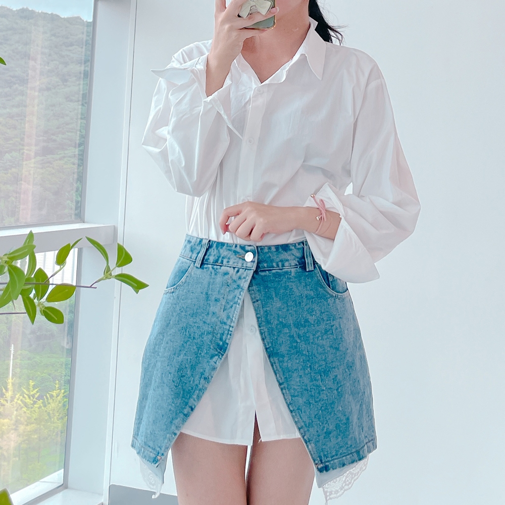 코디세트 루즈핏 롱 셔츠 레이어드 청 치마 투피스 (1color)
