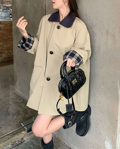 베어 체크 하프 트렌치 코트 버튼 자켓