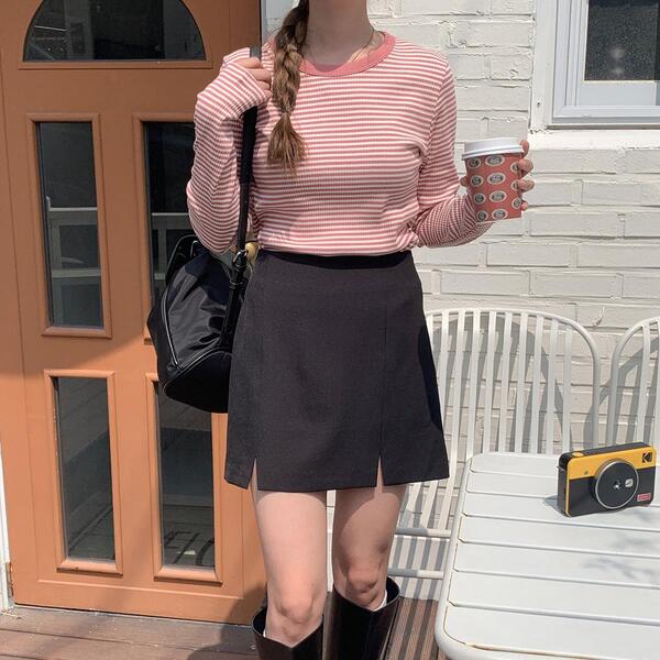 스트라이프 라운드넥 긴팔 골지 티셔츠 학생 봄 가을 상의 캐주얼 라운드티 캐쥬얼
