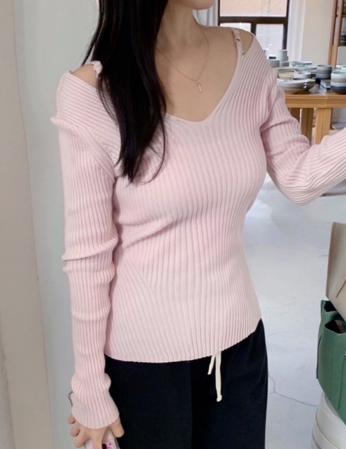 [한정수량] Mabye knit 연핑크 골지 브이넥 수지 니트