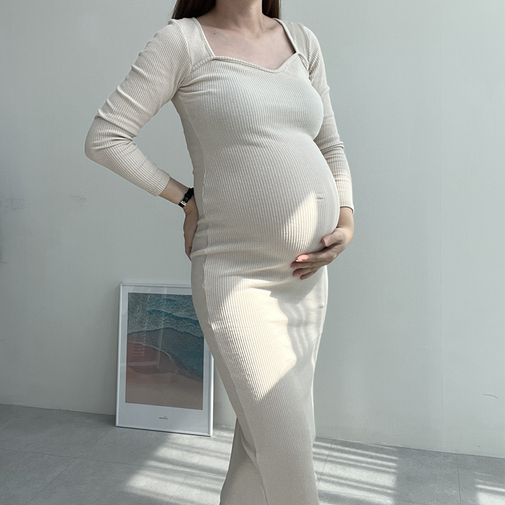 [리얼 임산부핏] 만삭 촬영 주수 사진 옷 스퀘어넥 골지 롱 뒤트임 임산부 원피스