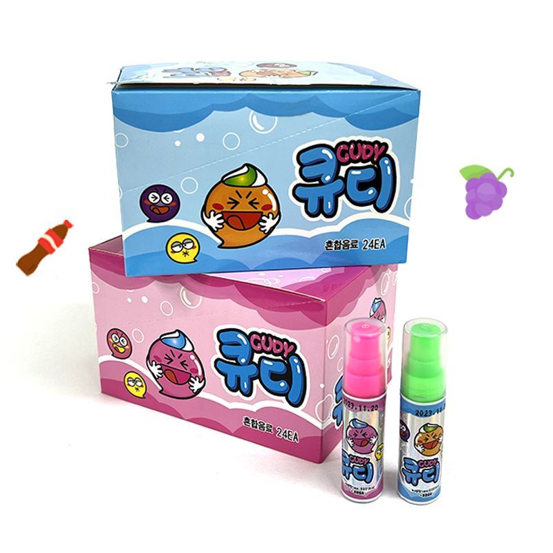 큐디 스프레이 캔디 사탕 14ml x 24개 한박스 콜라맛 포도맛 색상 랜덤 달콤 새콤 과일향 음료 휴대용 간식