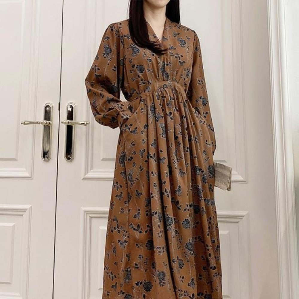 여자 브이넥 플로랄 벌룬 소매 캐주얼 롱 원피스