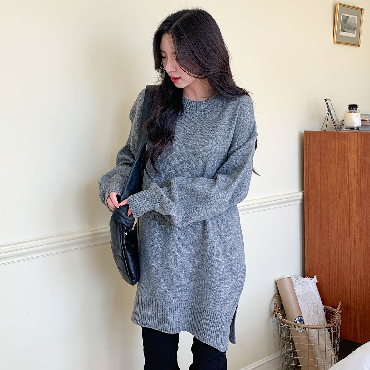 라프에 벌룬슬리브 밑단 트임 루즈핏 롱 니트