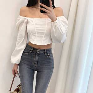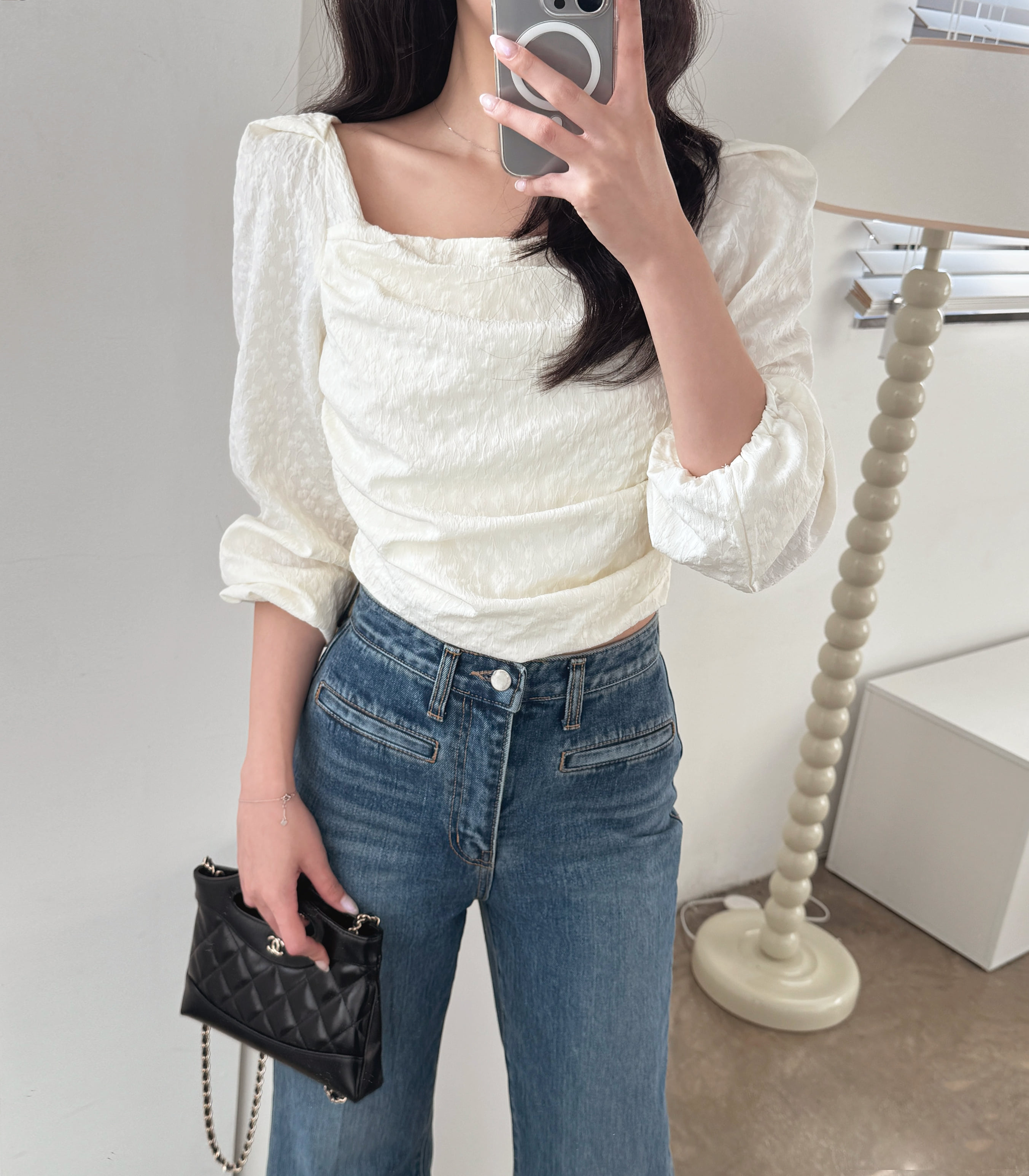 자카드 셔링 퍼프 스퀘어넥 블라우스