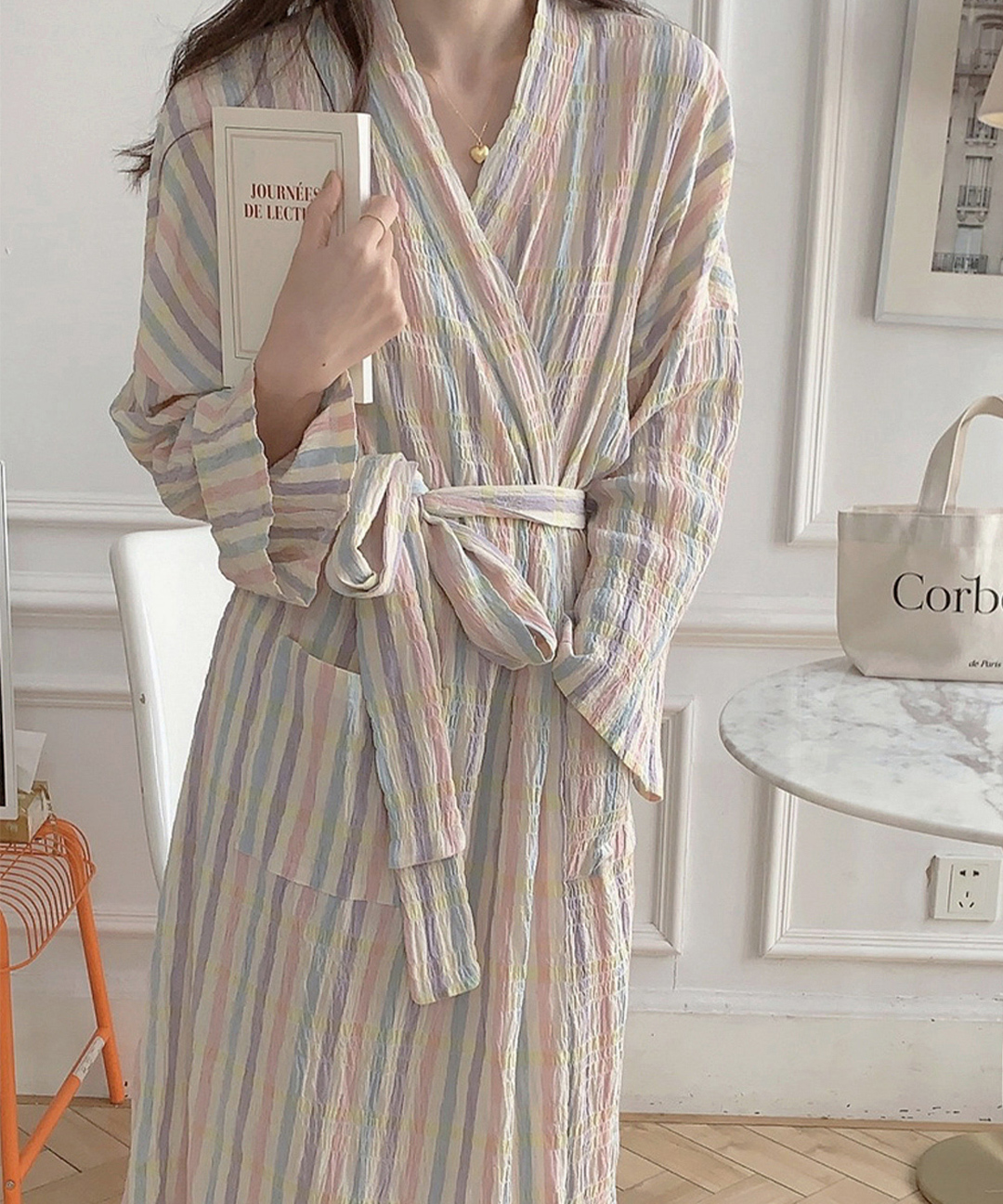 [고퀄리티] 레인보우 파스텔 - 로브 면가운 샤워랩 수면가운 샤워가운 샤워로브 잠옷 홈웨어 스트라이프 신혼잠옷 고급스러운 친구선물 봄가을 간절기 환절기 여리여리