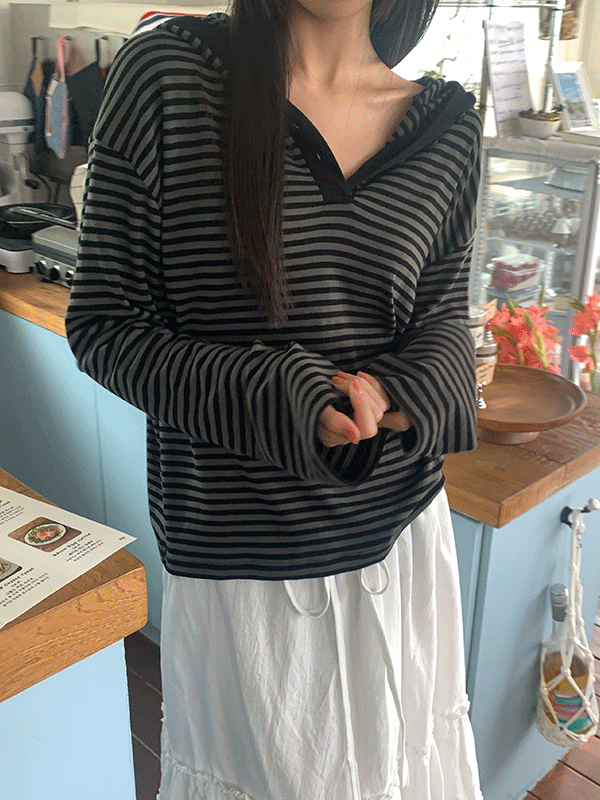 보크 스트라이프 후드 티셔츠