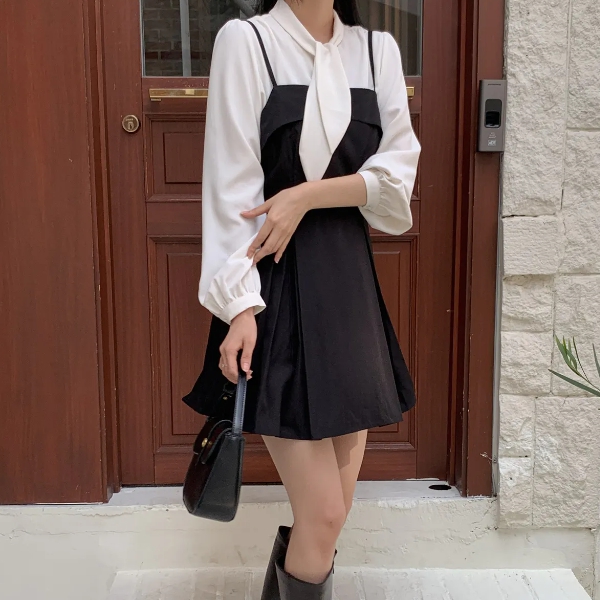 [하객룩/신상] 핀턱 a라인 플레어 뷔스티에 미니 원피스 키작녀 봄 가을 결혼식 하객룩 데이트 오피스