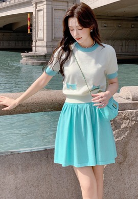 반팔 니트 미니 플레어 스커트 투피스 세트 셋업 봄 가을 데일리 데이트