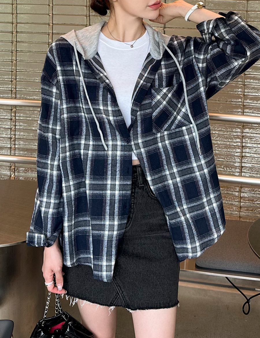 벌룬 루즈핏 후드 체크셔츠 남방 아우터 가디건 블랙 네이비 간절기