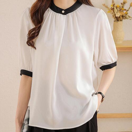 넥라인 진주버튼 배색 반팔 블라우스 소매라인 포인트