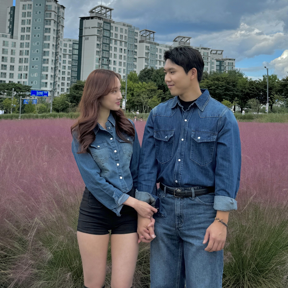 커플 시밀러룩 데님 워싱 청셔츠 청남방 남자 머슬핏 정핏 웨스턴 청 데님 셔츠 여자 슬림핏 크롭 청셔츠 커플셔츠