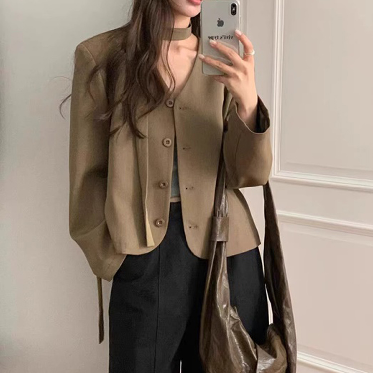 (당일출고/set) 브이넥 노카라 긴팔 하객룩 연말룩 어깨패드 리본 초커 타이 스카프 크롭 트위드 블레이저 자켓 세트 3color