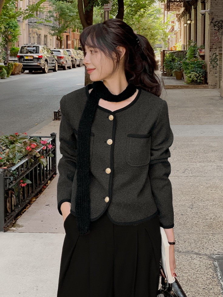 [44-120] 켄츠폴 모직 트리밍 버튼 세미크롭 자켓( 봄-가을-겨울-데일리룩-데이트룩-캐주얼룩-캠퍼스룩-러블리룩-하객룩-격식룩-출근룩-빅사이즈-120사이즈-자체제작-고급스러운-러블리-통통녀 )