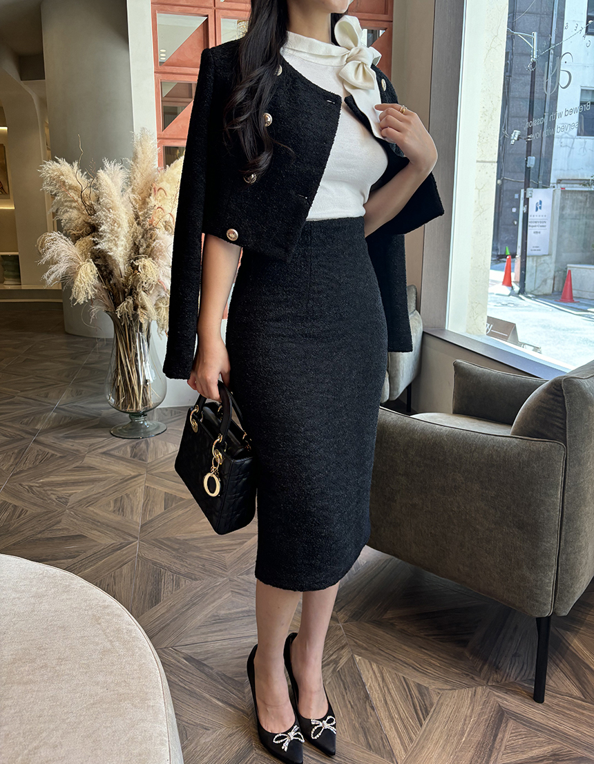 메이린 하이웨스트 H라인 울 트위드 하객룩 미디 스커트