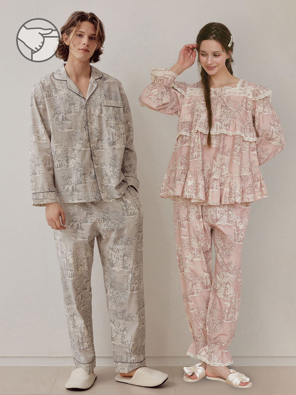 커플 마델 코튼 단추 긴소매 투피스 잠옷