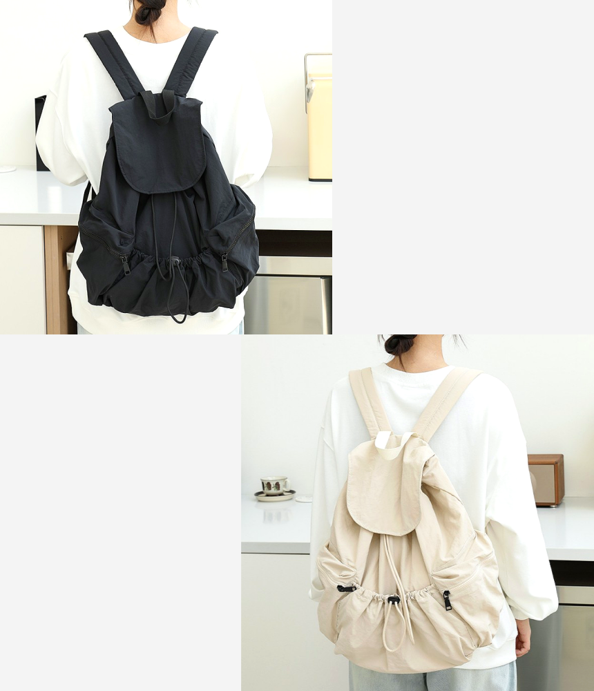 [2color] 휘뚤마뚤 데일리 스트링 백팩 y2k 여행 현체 캐주얼 텀블러 바스락 수납 나일론 경량 가벼운 카고 보부상 덮개 포켓 무지 가방