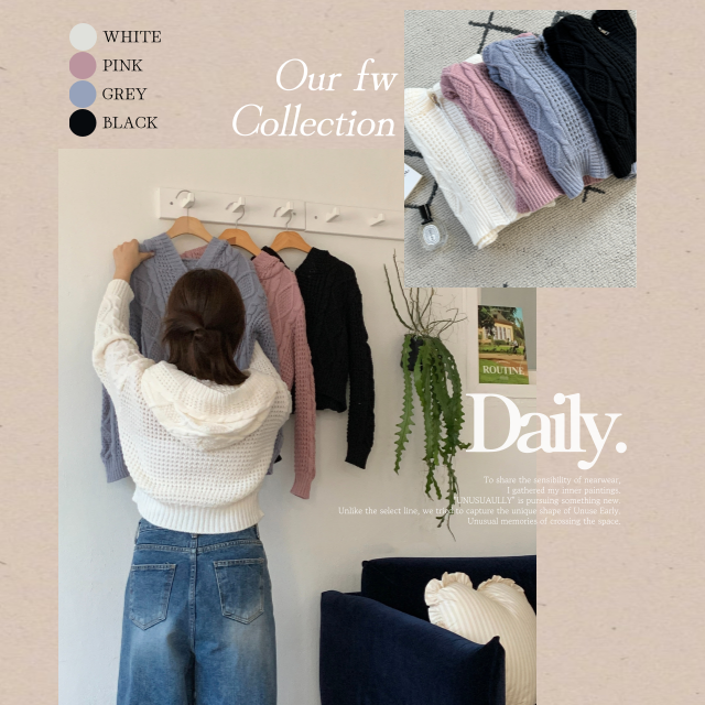 더블 꽈배기 후드 크롭 집업 니트 - 4color
