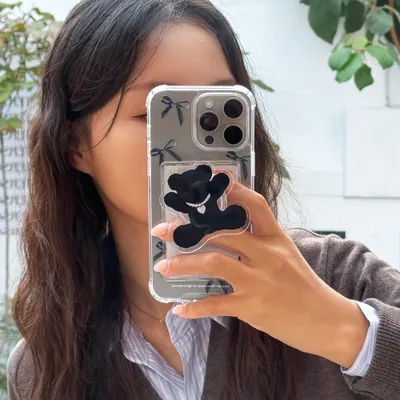 [단독] 갓성비👏 맥세이프 카드지갑+톡 일체형 올인포켓 블랙 베어 . 아이폰 케이스 스마트톡 아크릴 플라톡 핸드폰그립 톡홀더 커플 우정 투명 휴대폰 거치대 친구 생일 선물