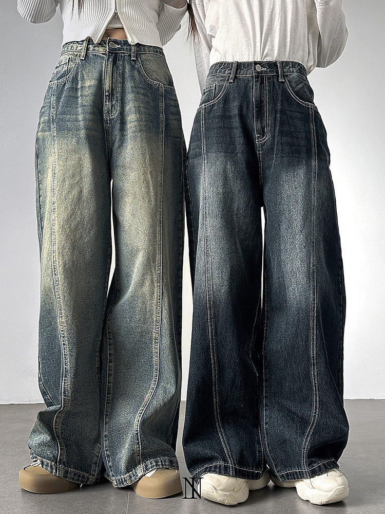 [숏/기본/롱🖤4color] 스티치 절개라인 스냅 버튼 하이웨스트 롱 와이드 데님팬츠