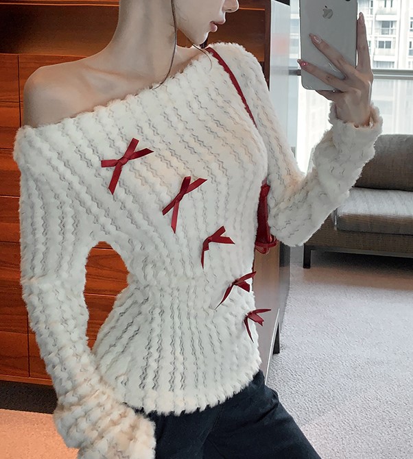 [니트아이템/러블리룩] 힙한룩 Y2K 슬림 오프숄더 리본 포인트 긴팔 니트 티셔츠
