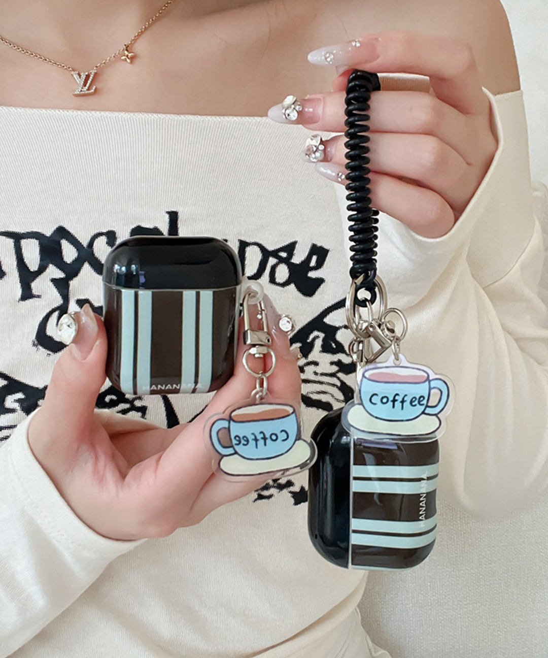 애플 에어팟4세대 에어팟 프로 프로2 스트라이프 패턴 실리콘 커버 커피 키링 스프링 스트랩 귀여운 디자인 airpods4 airpods pro pro2 에어팟4 케이스