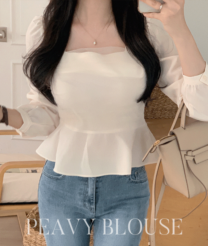 [여리핏✨]피비 뒷리본 프릴 이중쉬폰 플레어 스퀘어넥 퍼프 블라우스