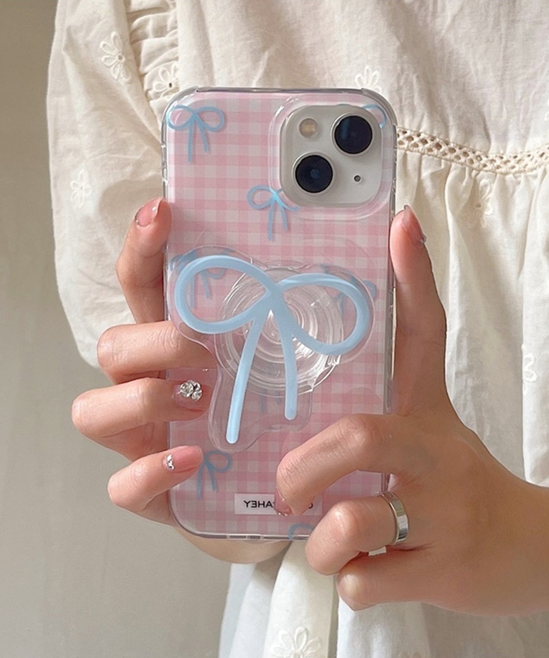 오늘출발❤핑크 블루 리본 발레코어 그립 스마트톡 아이폰케이스 하드 젤리 핸드폰 체크 생일 선물 ( 아이폰 12 13 14 15 16 프로 맥스 )