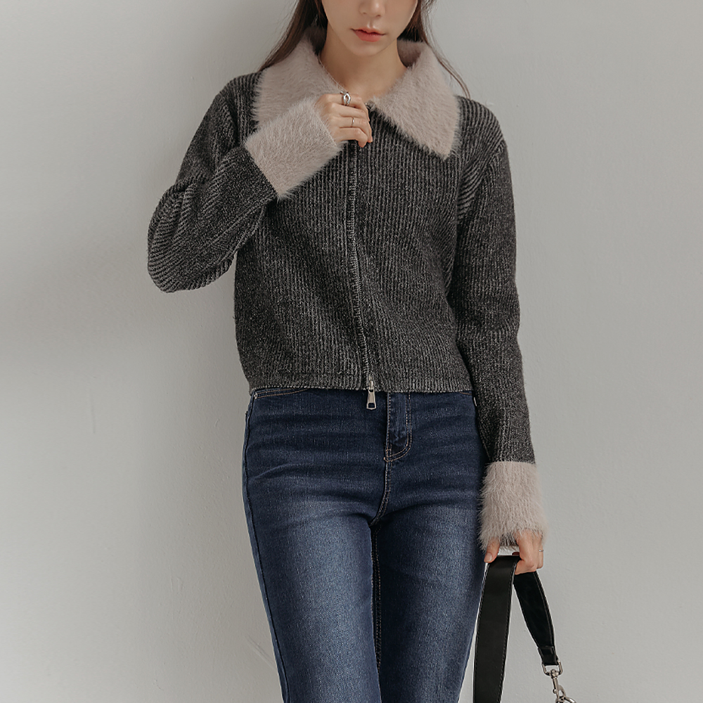 웨일러 촉촉 컬러링 카라 니트 집업 (가을/간절기/겨울/아우터/퍼가디건/소매퍼/헤어리/배색/골지/데이트룩/연말룩)