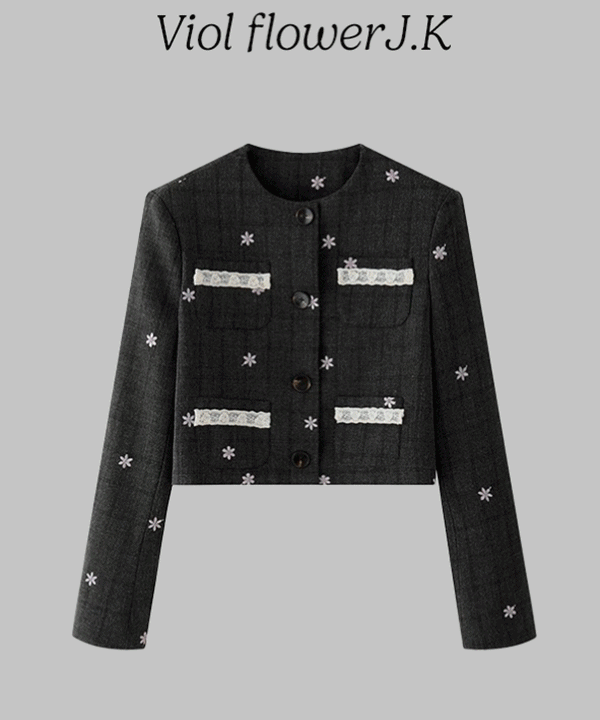 바이올 자수 체크자켓 레이스 포켓 노카라 y2k 아이돌 플라워 결혼식 하객룩 데이트룩 셀프웨딩 브라이덜샤워 셋업 고급스러운 명품스타일 여리여리 파티룩 연말모임룩