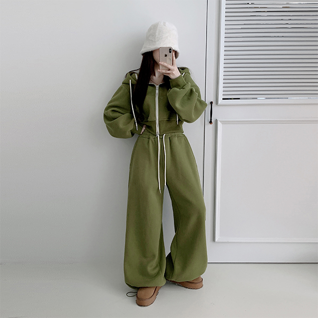 [기장선택!/존예핏] 레디 루즈핏 크롭 자수 투웨이 기모 후드집업+밴딩옆핀턱 와이드 트레이닝 기모 팬츠 set (4color)