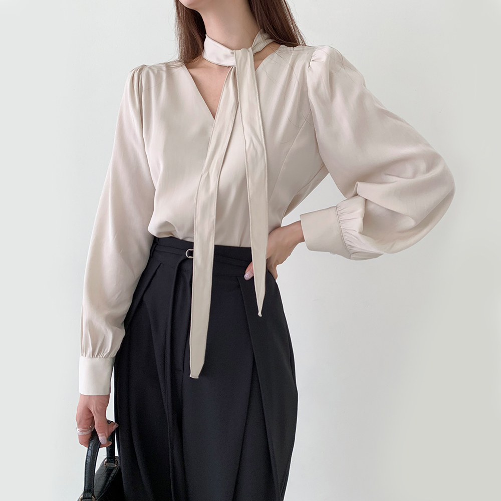 블라우스 리본 샤틴 셔츠 셔링 실크 쉬폰 퍼프 새틴 타이