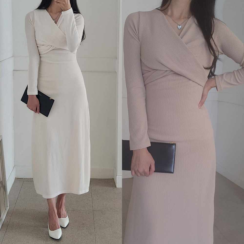 [국내제작/여신] 골지 니트 긴팔 롱 원피스 브이넥 하객룩 임산부 만삭 촬영 주수 키작녀